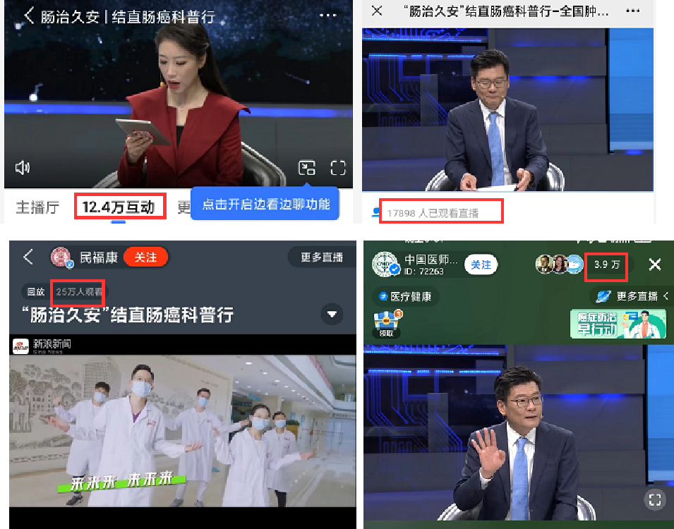 2022年4月15日至21日是第28個(gè)全國(guó)腫瘤防治宣傳周,康立明生物聯(lián)合結(jié)直腸領(lǐng)域38名各級(jí)專家大咖,通過線上直播、錄制公益視頻、媒體宣傳等形式,多維度、全面立體向公眾傳播結(jié)直腸癌防治知識(shí),提升大眾腸癌早期檢測(cè)意識(shí)。媒體報(bào)道50篇次,科普直播7場(chǎng),直播平臺(tái)近20家,各大平臺(tái)觀看量近252萬人次,取得良好宣傳效果。